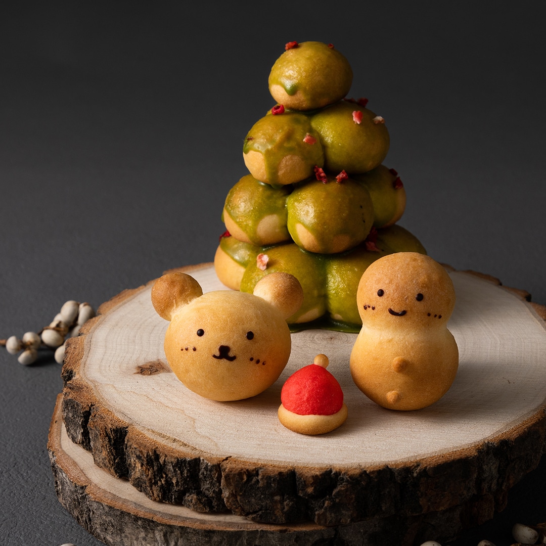 いちごがふわっと香るチョコレート、とろけるくちどけのカスタードクリーム、生地が織りなす優しい味わいの「いちご香るハートバームクーヘン」の上にクリスマスツリーなどの食べられるパンデコをご自身でトッピング!