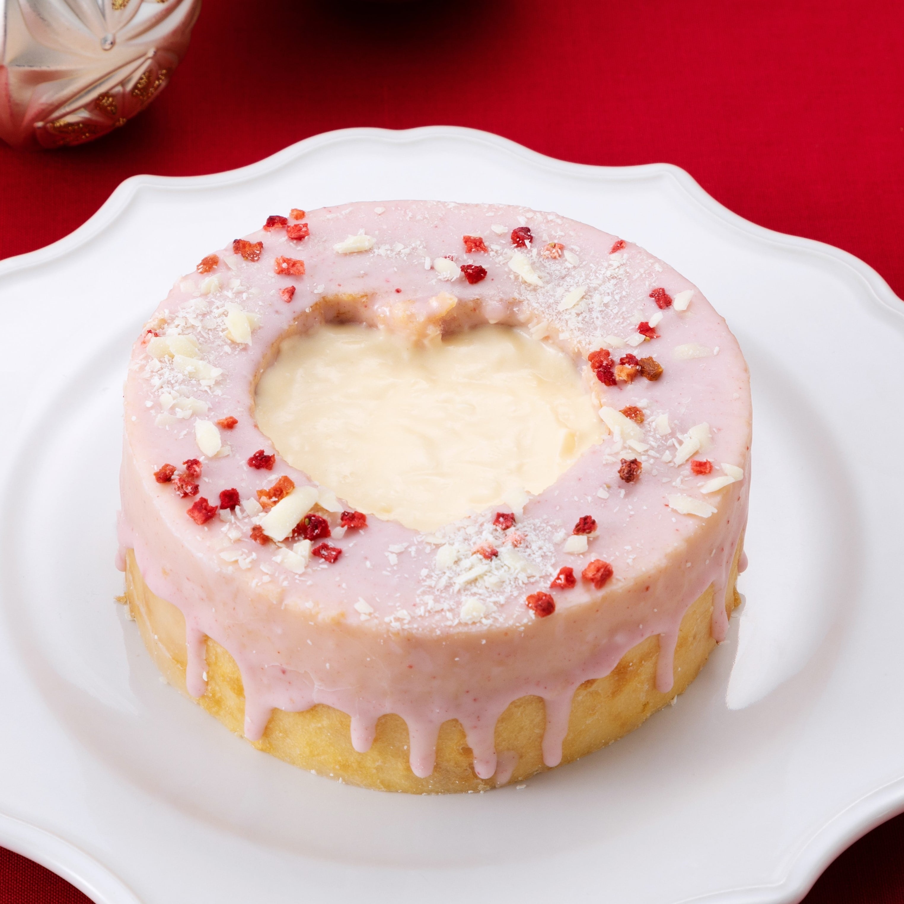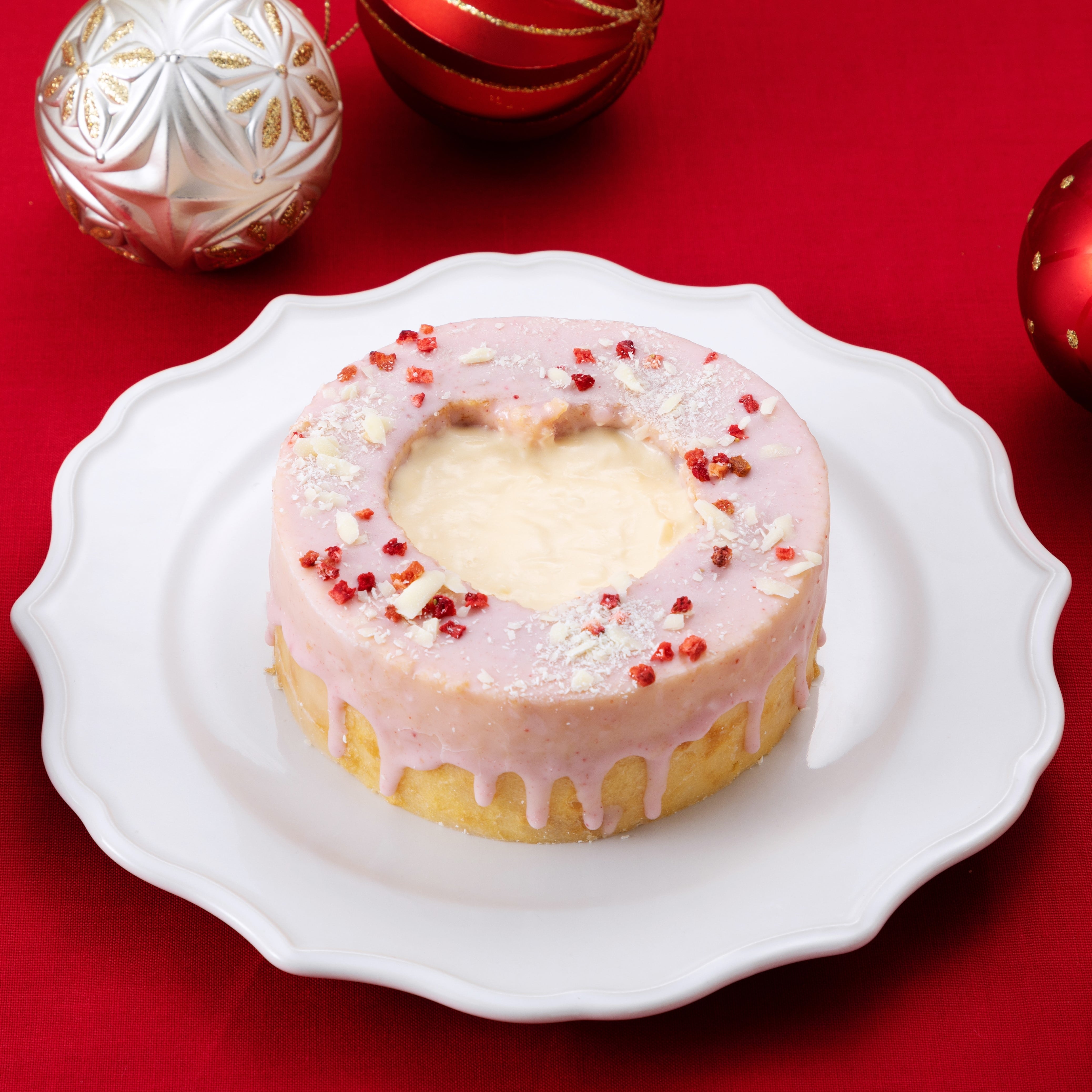バームクーヘン食感にこだわったカスタードをイメージした味わいのバームクーヘンに、ストロベリーチョコレートをコーティング。フリーズドライのいちごとホワイトチョコをトッピングし、中心にはくちどけの良いカスタードクリームを入れました。