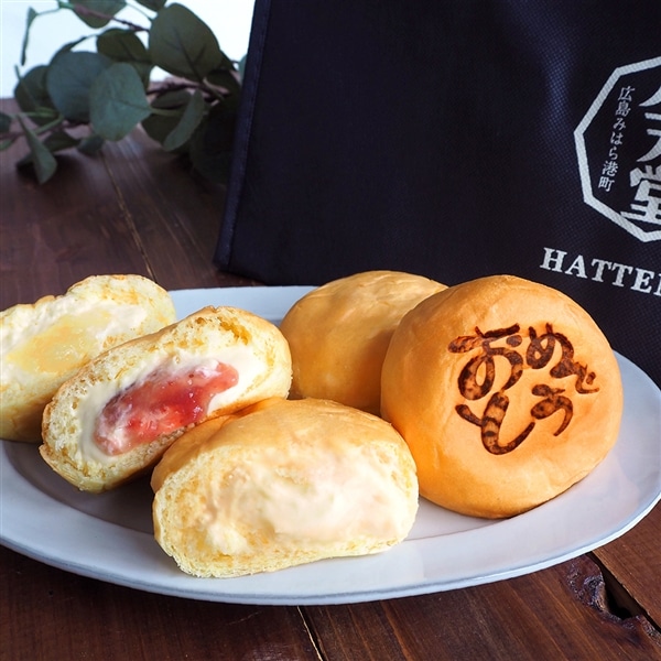 おめでとうくりーむパン×6、くりーむパンあまおう苺×3、とろける瀬戸内くりーむパンレモン×3、オリジナル保冷バッグ×1