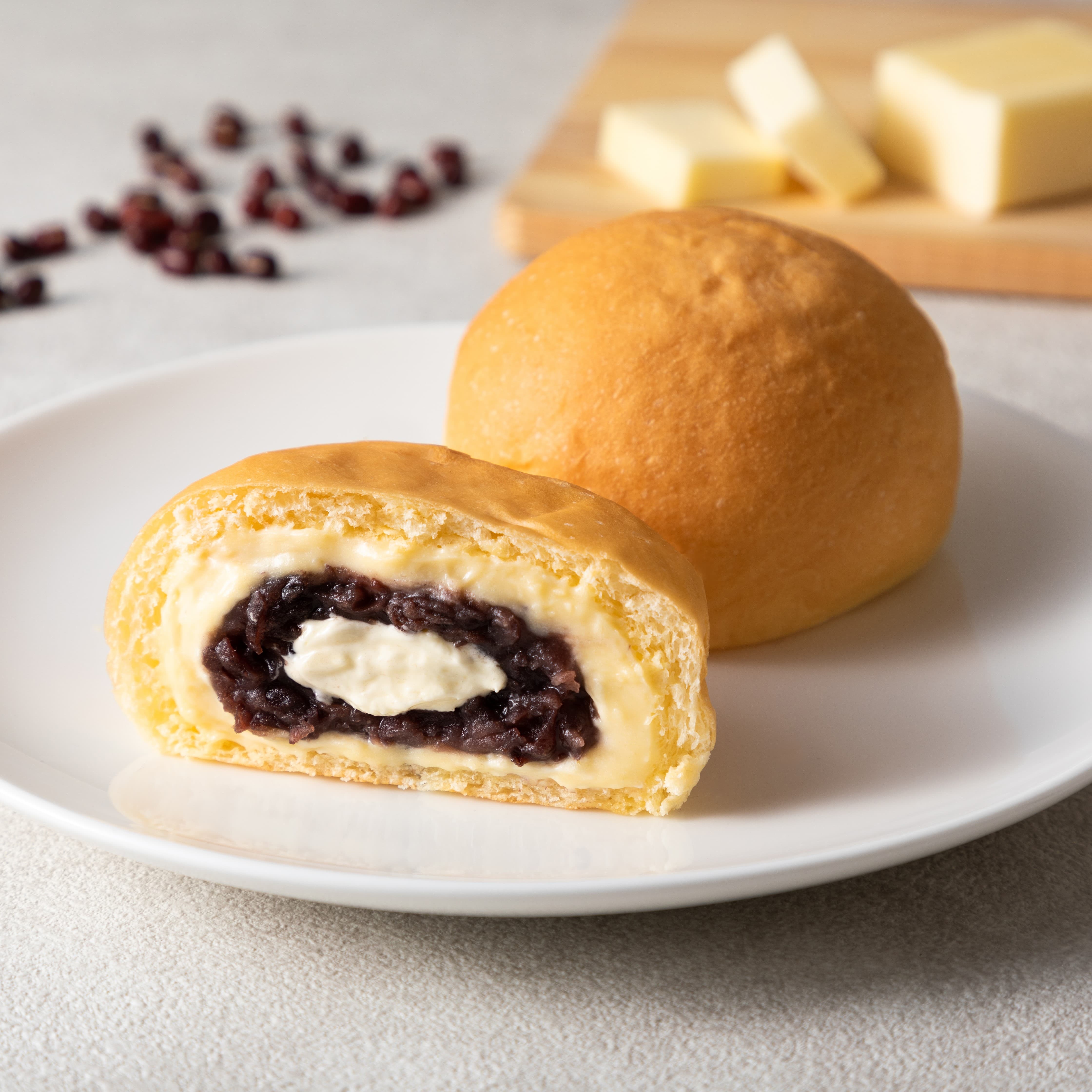 あんバターふんわりしっとり柔らかな生地の中に、八天堂のクリームと北海道産小豆を使用した八天堂オリジナルのあんこ、バターを入れた3層のくりーむパンです。